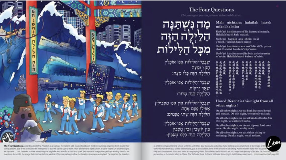 The Beijing Haggadah: Leon Fenster now lives and works in the Taiwan Jewish Community (that's the official name), but spent many years, himself, in the Beijing community; he taught at Tsinghua University on the connections between the Chinese diasporic experience and his dreamlike Jewish urban art. In the Beijing Haggadah, he writes out the traditional text in Hebrew, English and Chinese and uses local landmarks and community members in the art. It was developed in collaboration with the Beijing Jewish community, as far as I'm aware. Order here.