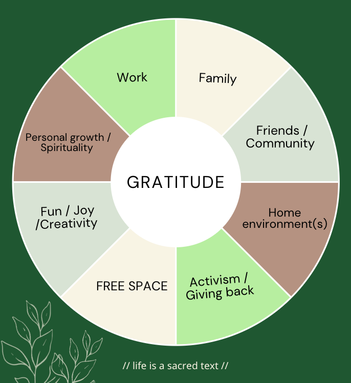 You can see where I'm going with this, yeah? The wheel's just meant to be a trigger, a reminder of ways to scan your life, a supposition that you can probably find at least five things to be grateful for, even when things are really sucky. And Free Space is exactly thatâ none of our lives are the same, and our lives change from day to day, week to week. I don't want this to be limiting at all, so there's the open door for whatever else might want to come in that I certainly can't anticipate.