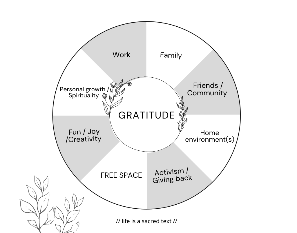 You can see where I'm going with this, yeah? The wheel's just meant to be a trigger, a reminder of ways to scan your life, a supposition that you can probably find at least five things to be grateful for, even when things are really sucky. And Free Space is exactly thatâ none of our lives are the same, and our lives change from day to day, week to week. I don't want this to be limiting at all, so there's the open door for whatever else might want to come in that I certainly can't anticipate.