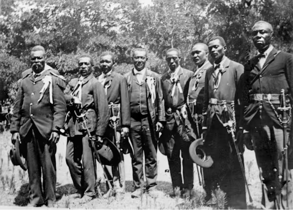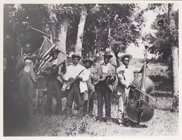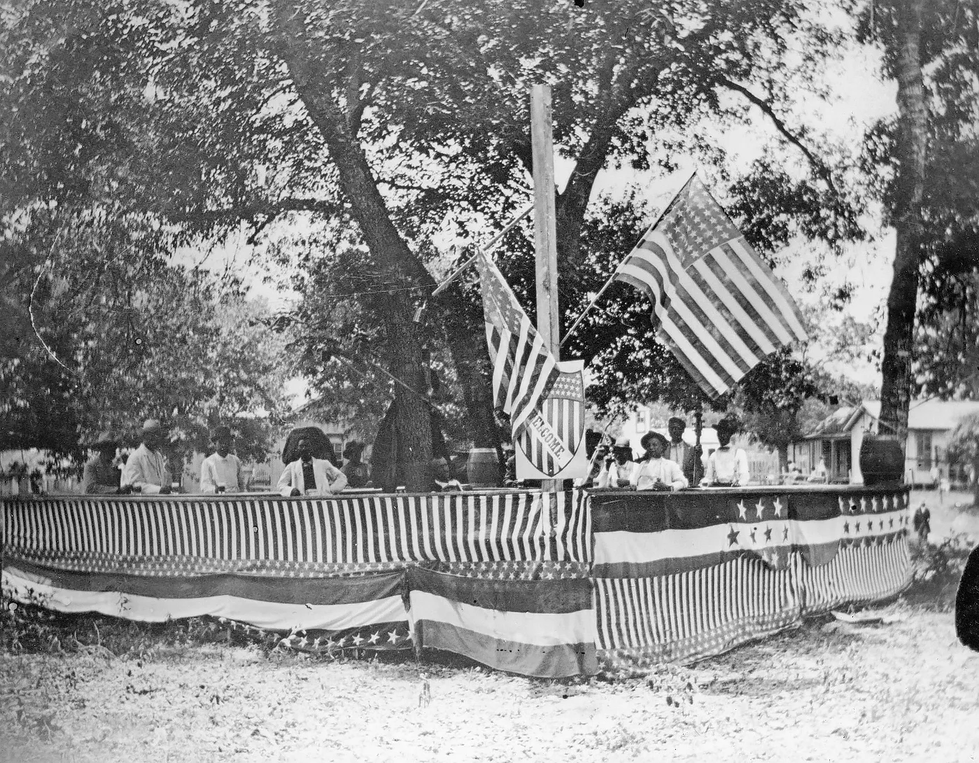 Set of seven old-fashioned black and white photos. Clockwise from top left: Group on Emancipation Day, circa 1880s, in Houston's Emancipation Park. Reverend Jack Yates, who led the community purchase of the Park in 1872, is pictured on the far left, and his daughter Sallie Yates dressed in black in the center. Group of children on Juneteenth, celebrations in Eastwoods Park, Austin, 1900. Group of elderly people on Juneteenth, celebrations in Eastwoods Park, Austin, 1900. Group of men in Civil War uniforms, likely for a re-enactment of the Unionâs entry into Galveston; Juneteenth celebrations in Eastwoods Park, Austin, 1900. Juneteenth band, Eastwoods Park, Austin, 1900. Detail from a photograph of celebrations in Richmond, Virginia, ca. 1905. Main stage Juneteenth decorations, Eastwoods Park, Austin, 1900. All Austin photos by Grace Murray Stephenson.