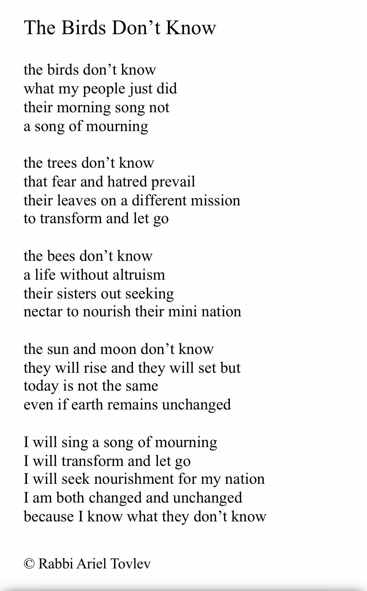 And let's end with this poem, that to my mind is really more of a psalm, from the good Rabbi Ariel Tovlev:
