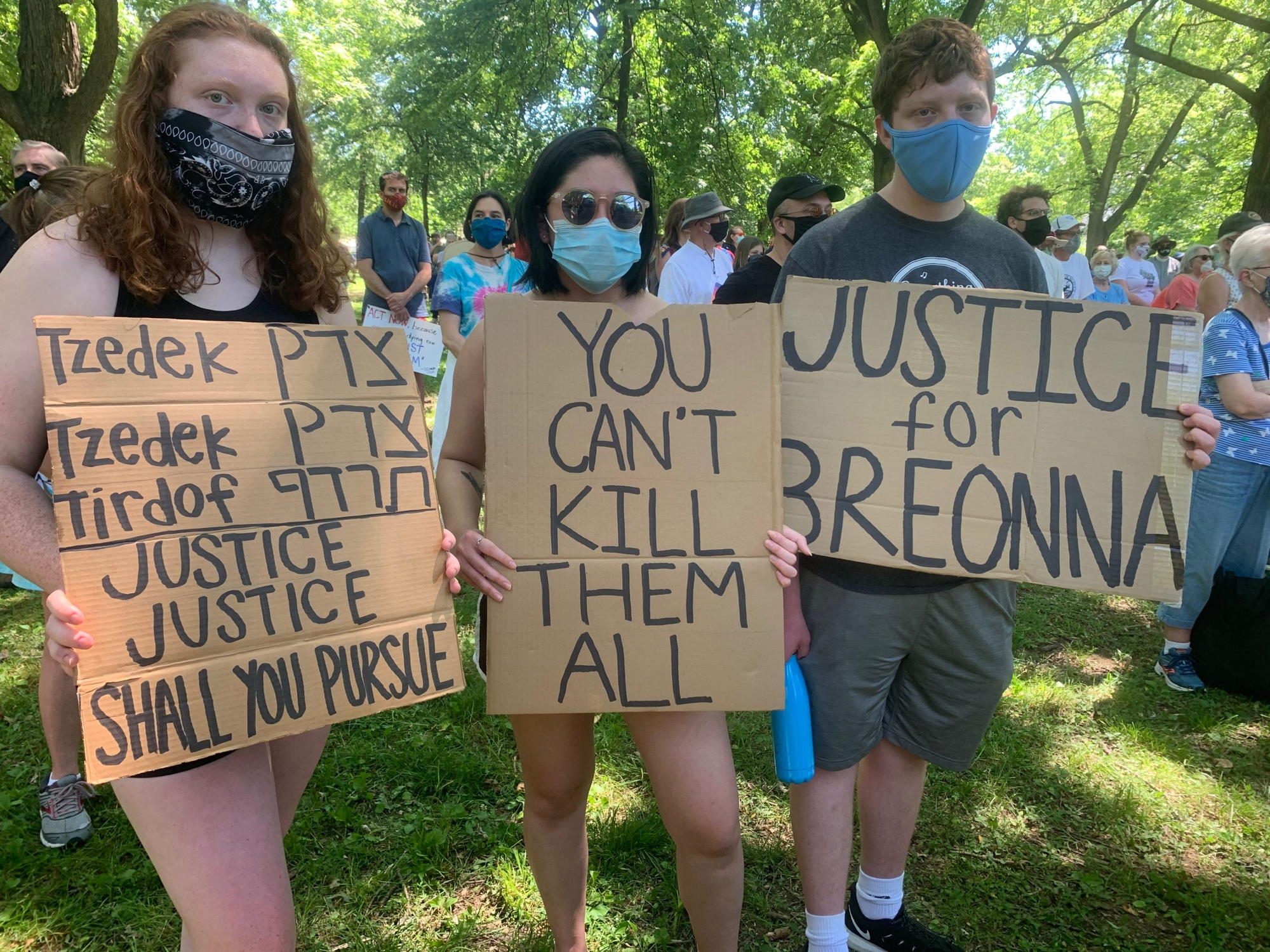 No, but really, it's a perennial. Gallery of eight images of various people at protests for a range of causes, from Breonna and Black Lives Matter to Immigrant Justice to (in English, Hebrew and Arabic) peace to other actions whose purpose is not clear, holding signs that say, in Hebrew, English or both: Justice, Justice, you shall pursue