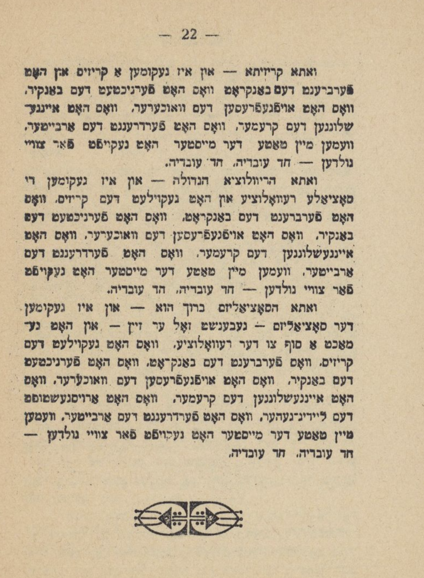 V’oso Harevolutsye hagdoylo [Then came the supreme revolution]—Then came the socialist revolution and demolished the crisis that scorched the bankruptcy that annihilated the banker that wolfed down the loan shark that gobbled up the shopkeeper that displaced the bum that beat out the worker that my father bought for two pennies. Chad Oyvedyo, Chad Oyvedyo.