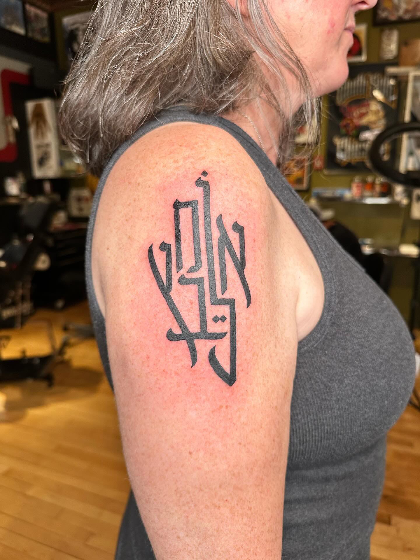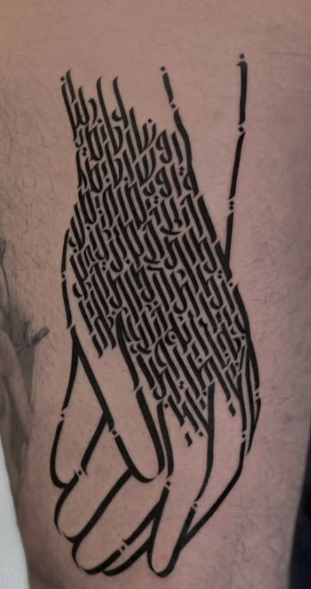 The work of Omri Goldzak: Left-- Overlapping hands with calligraphy from a Leah Goldberg poem: פְשׁוּטִים וּפְשׁוּטִים הַדְּבָרִים וְחַיִּים, וּמֻתָּר בָּם לנִגְעַֹּ, וּמֻתָּר, וּמֻתָּר לֶאֱהֹב "And the things will be simple and alive, and it is permitted to touch them, And permitted, and permitted to love." Middle: A gigantic calligraphic alef, א, the first letter of the alphabet and also representative of Ain Sof, infinity, the oneness of the divine, the first word and thus the totality of the Ten Commandments (and thus sometimes Revelation) and all sorts of other good things; Right: My friend Jen's shoulder, reading Ometz Lev, courage. Jutt