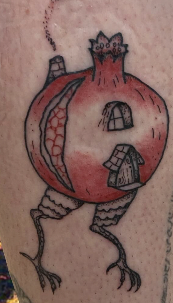Some beauts by Sian_Shine; if Baba Yaga's house was a pomegranate (pomegranates are Jewish symbols; they're all over Jewish (especially Biblical) texts, we talk about how there are 613 seeds for the 613 mitzvot, etc etc; Heneni ("here I am") in amazing medieval animal illuminated lettering. And I was just required to include this hyperrealistic Kedem grape juice bottle, OK??? By Gab Yunis.
