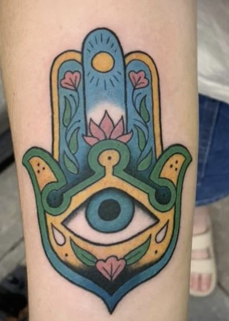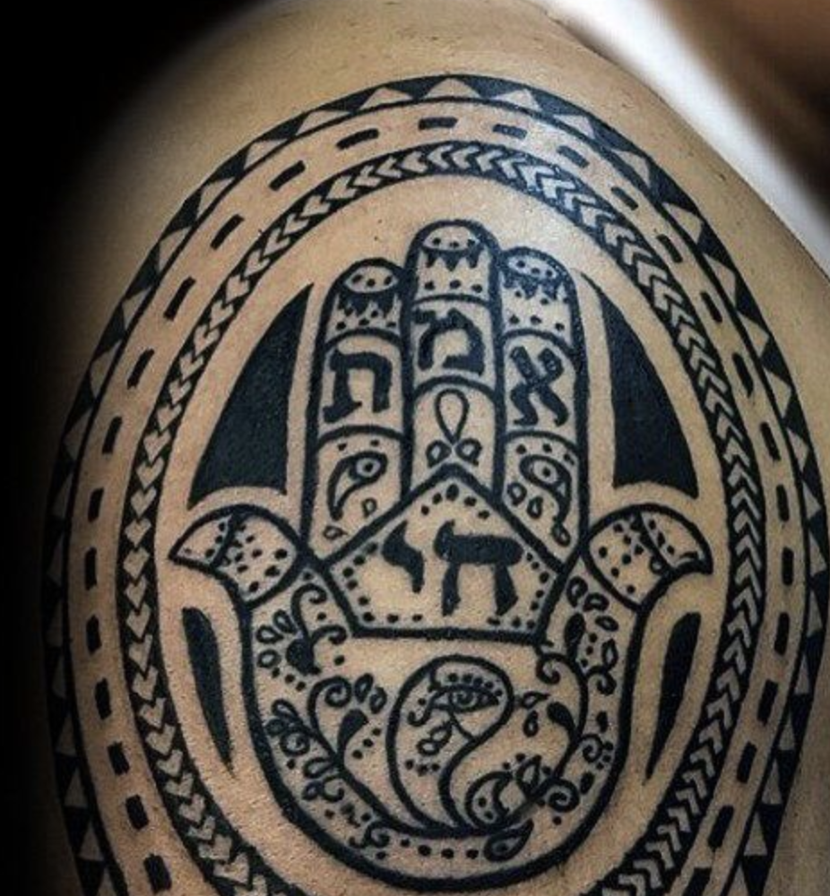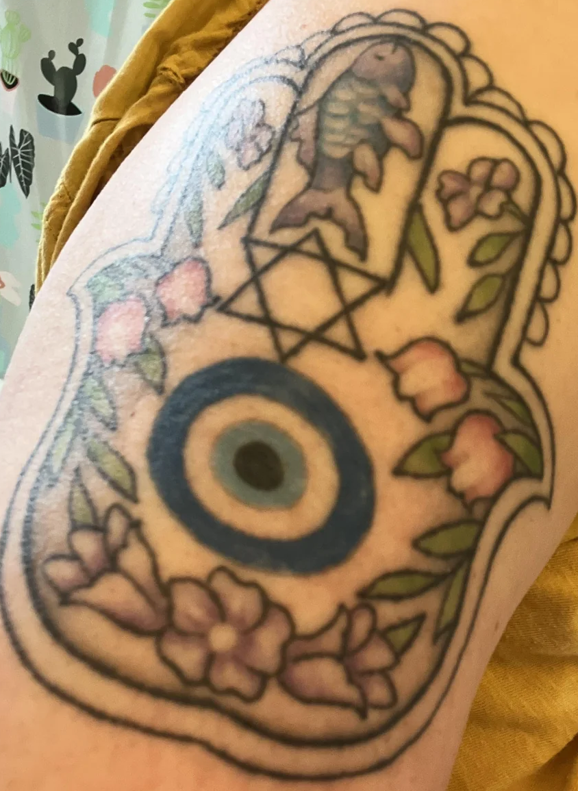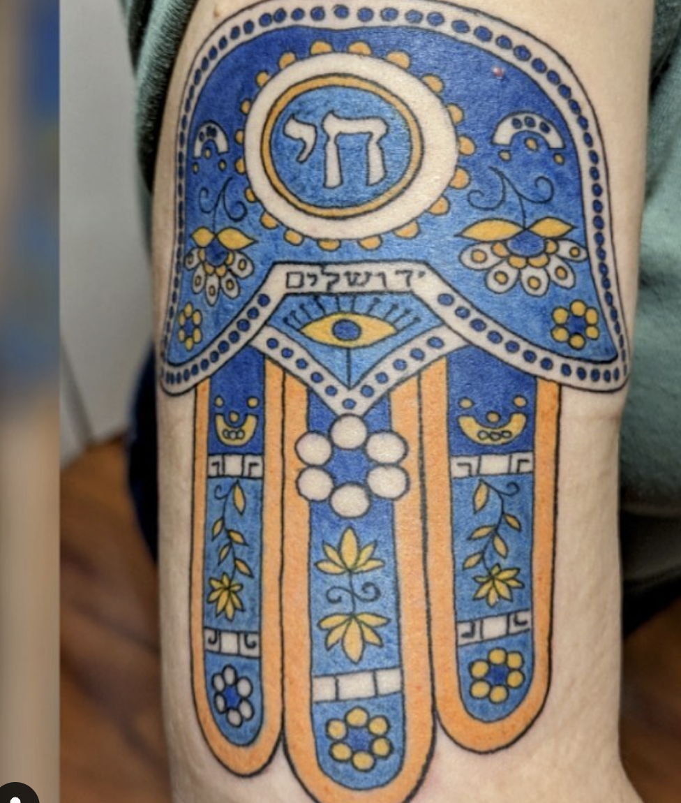 And of course there are a bevy of hamsot, to ward off the evil eye. Here are just a few--the first has a traditional blue round eye to ward off the evil eye in the center, surrounded by pink and lavender flowers, a Star of David right above it, and just above that, in the middle finger, a fish, representing the Leviathan upon which the righteous feast in Messianic times. Artist is Anna at Halo in Greensboro, NC. Next (Clockwise) is a Star of David, Chai/חי/life, and henna-like swirls and highlights of orange, blue, green and red by Ann Palmer. I unfortunately don't have the name of the artist who did the elaborate shoulder piece with Chai in the middle and Emet /אמת/Truth on the index, middle and ring fingers, with henna swirls and little eyes buried in the design, with a circular border of strong arrow shapes, with a ring of dotted lines around that, finished by a triangular border serving as the outermost ring. Blue hamsa with orange border and flower details, chai with circle and flowers, orange eye in the middle, and dots, by Peter Skidmore. Hamsa in dark teal, filled with teal and yellow, and floral and sun motifs, including small pink flowers and green leaves with a big blue eye in the center by Shira Sterling. And, of course, how can we pass up the sacred, traditional form: "old 90's tattoo coverup hamsa," elegantly burying that fading tribal design in a new, fresh protective hand with additional henna-like details by Noah Offitzer.