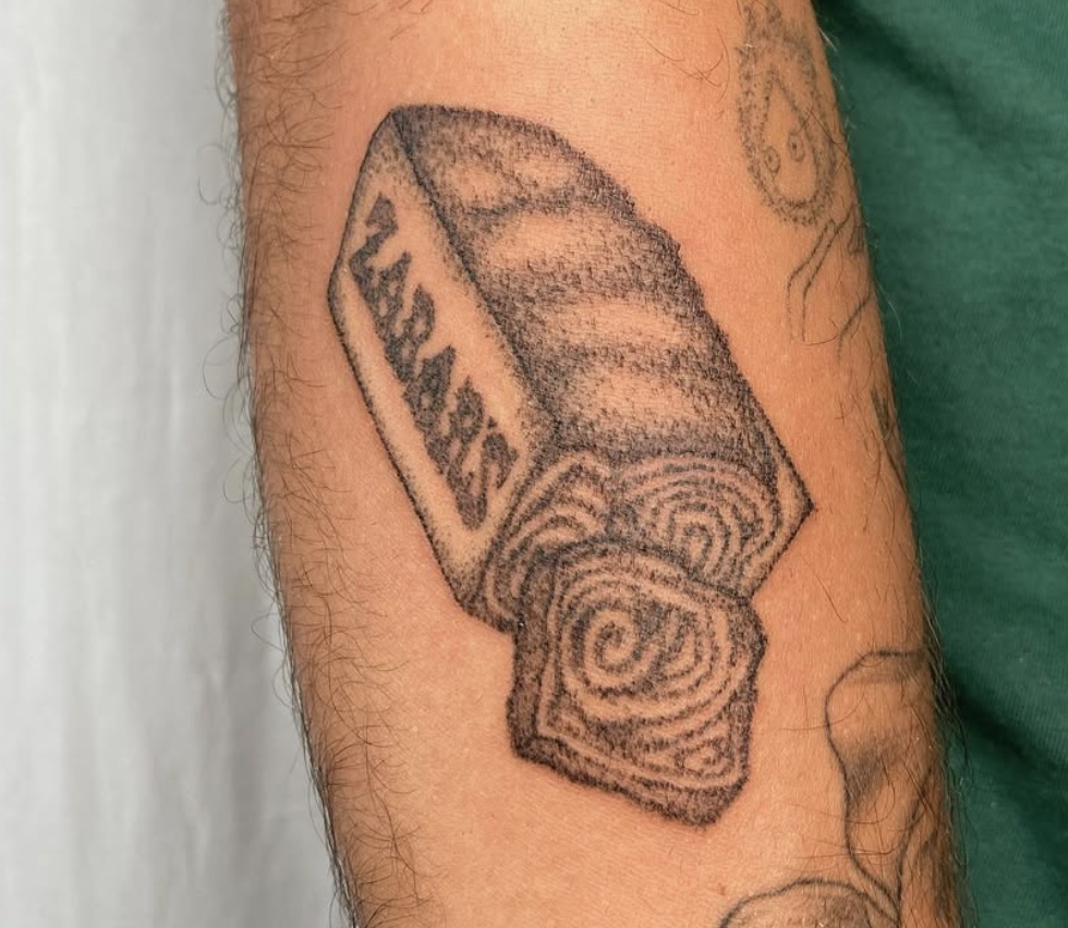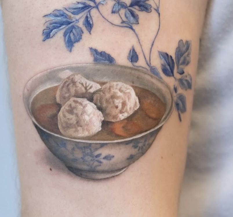 When Ashkenazim Ashkenazi, they Ashkenazi HARD. Tats include (clockwise) a knish line tat, a pickle mezuzah curved in bright greens and a big Shin ש on it (both by Sian_Shine). Zabar's babka!!! by Evelyn Wang, matzah ball soup by Noa Margalit. Bashert, the Yiddish word for soulmate, fate, destiny, by Tahini.jpg