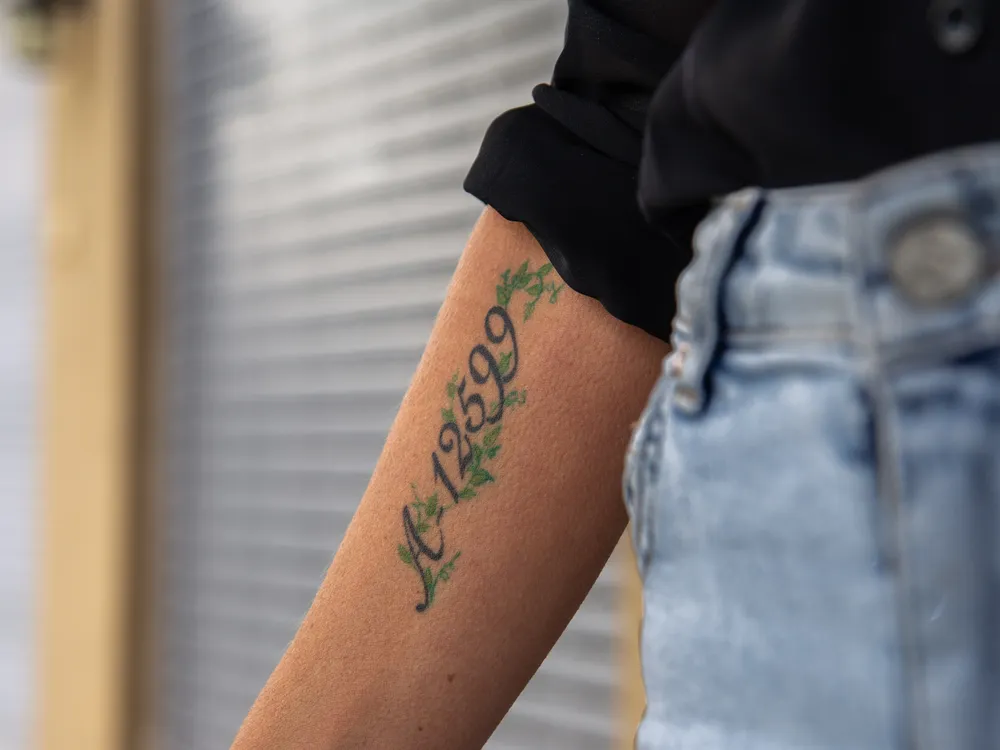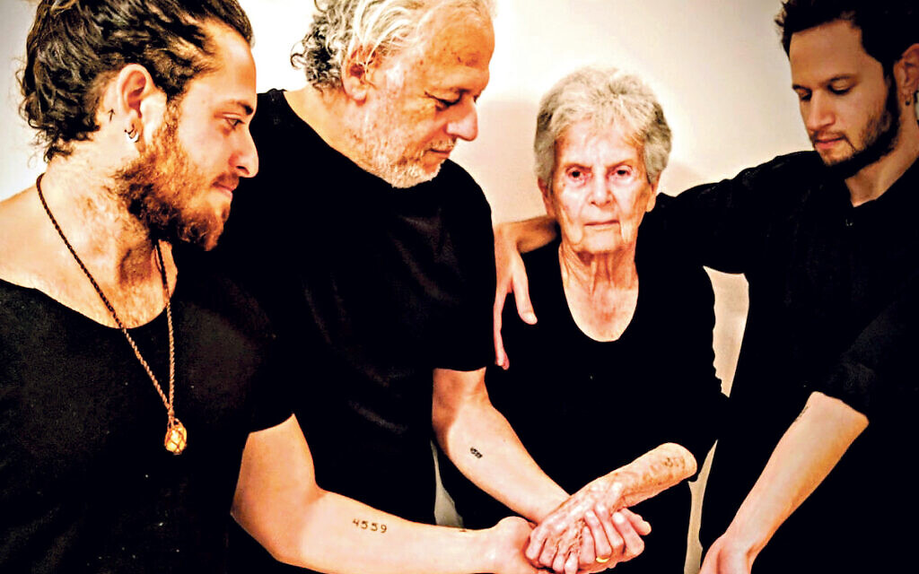 L: A grandmother's arm, with her grandchild's tattoo with the same number and the words "Never forget" in Yiddish underneath. Middle: Amir, a bearded white twentysomething, Oded, a bearded white man with white hair, in his fifties, most likely, Livia Ravek, an elderly white woman, and Daniel Philosoph, a bearded white man in his twenties, all stand with their arms clasped, with their shared tattoos visible-- the Auschwitz concentration camp number 4559 on their inner forearms. R: Orly Weintraub Gilad has her grandfather's Auschwitz number, A-12599, tattooed on her arm, with greenery interspersed. You can see the side of her jeans and the inner part of her arm visible; she, too, wears the number on the upper part of her inner arm.