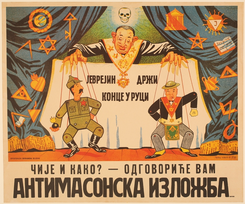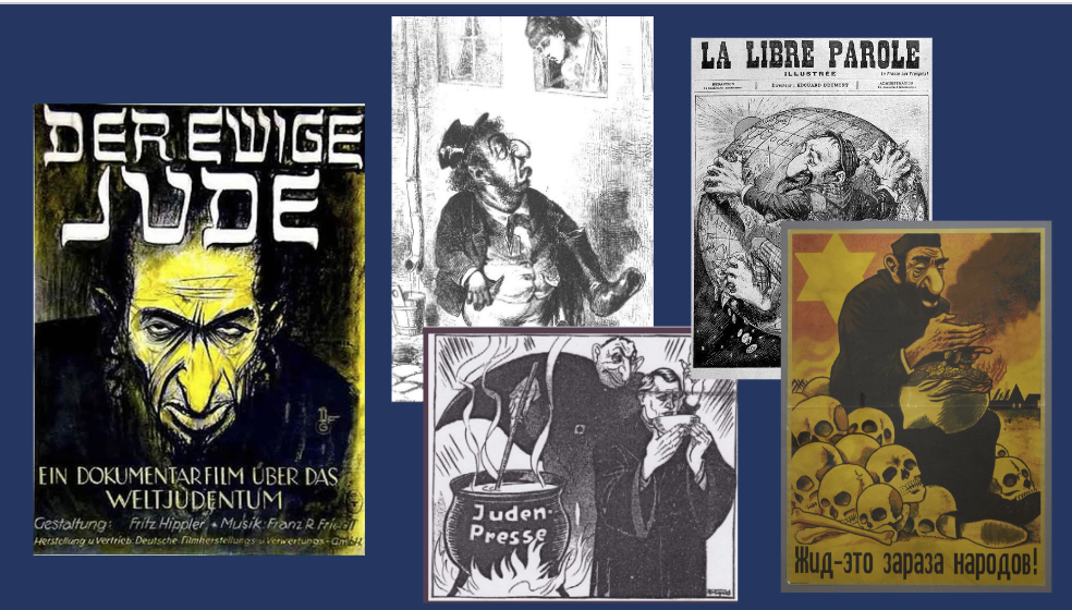 From left: Poster for "The Eternal Jew," a 1940 Nazi propaganda film presented as a documentary; antisemitic caricature shortly after the 1873 Vienna stock exchange crash-- the woman is surprised that this Jewish "Baron" has been reduced by the crash to a street vender; Der StĂźrmer, 1932, The Jewy Devil's potion's made in a caldron labeled, âJewish Pressâ (because we run the media, dig? hahaha); Antisemitic caricature of a shabby Jew grasping the whole world in the French La Libre Parole in 1893, a year before the Dreyfus Affair would begin; "Jews- A People of Contagion!" Nazi-produced for Russian readers, 1943. ⌠and continues, insidiouslyâŚ
