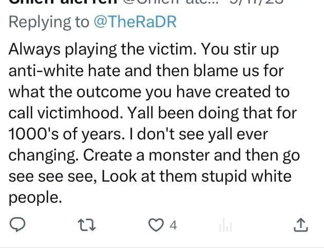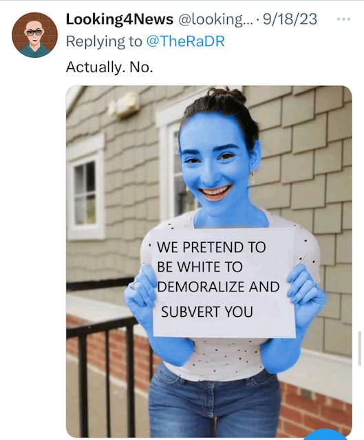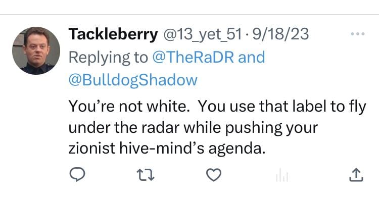 Three tweets I got last year from Twitter's most charming denziens, reminded me helpfully why I left the joint. (I'm on Bluesky now, btw!). Once again, apologies to those who rely on alt-text, it's not that crucial, it's just a few terrible people telling me that I'm not white in some nasty ways in response to some tweet in which I called white Jews: "white Jews." đ¤ˇ