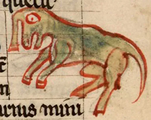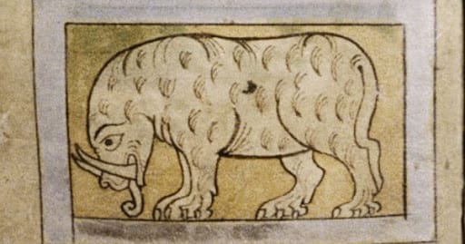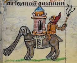 OK, and since "people drawing elephants even though they haven't seen an elephant" was a whole genre in the Middle Ages, here are some other glorious examples. I don't know why there's no alt-text here, but suffice to say, there are six images of elephant-ish like creatures being depicted here. My favorite is a hapless fellow in the bottom center who looks kind of like an earless donkey shocked to discover that he's got a snork-like appendage growing out of the top of his head.